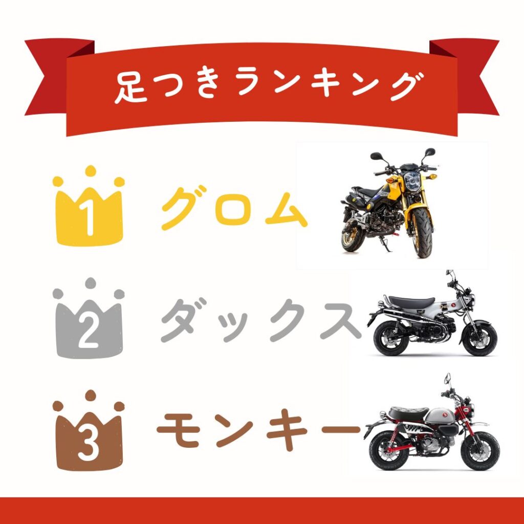 1位はグロム。平均身長の女性でも難なくまたがれる高さです。身長の高い方であれば、信号待ちでも両足が地面に着きます!
